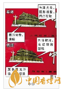 真品“中華”印刷套色準(zhǔn)確,字跡清新、筆畫均勻,字樣邊緣呈細(xì)微的齒輪狀,而不是人們普遍認(rèn)為的平滑狀。假煙字跡模糊、筆畫不均勻,字樣邊緣呈平滑狀。真品“中華”原產(chǎn)地標(biāo)志采用中國地圖圖案,細(xì)看海南島和臺灣島為空心,在某些角度和光線下圖案背景會呈現(xiàn)“中華”字樣,標(biāo)志線條、圖形、隱形字跡清晰可見。假煙原產(chǎn)地標(biāo)志圖形模糊、線條較混亂。