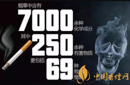 香煙內(nèi)的化學(xué)物質(zhì)主要是干煙草,但是經(jīng)過(guò)化學(xué)處理又加了很多添加成份。點(diǎn)燃香煙的煙霧含約4000種化學(xué)物質(zhì),很多是有毒物質(zhì),引致異變物質(zhì)及有數(shù)千種致癌物質(zhì)。香煙內(nèi)常見(jiàn)對(duì)身體有毒物質(zhì):尼古丁、鋁、氨/阿摩尼亞、砷、苯、丁烷、鎘、銫、一氧化碳、哥羅芳、氰化物/氰化氫(山埃)、滴滴涕及類(lèi)似農(nóng)藥、乙醇、甲醛、氰化氫 (山埃類(lèi)化合物)、鉛、鎂、甲烷、甲醇、水銀(汞)、煙堿 (尼古丁)、石油、焦油、氯乙烯、硝酸鉀。