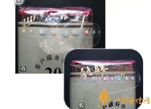 5、小盒拉線。真煙的小盒拉線有麻點(diǎn),且拉線上的字是膠印;假煙的小盒拉線沒有麻點(diǎn),拉線上的字為凹印(上真下假)。