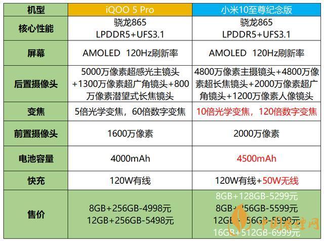 小米10至尊紀(jì)念版的8GB+256GB售價(jià)5599元,12GB+256GB售價(jià)5999元,iQOO5 Pro分別為4998元和5498元,兩個(gè)版本的差價(jià)分別是500元、600元。
