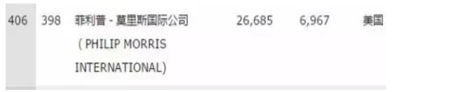 翻遍整個榜單,終于在末尾出發(fā)現了榜單唯一一家煙草公司--菲利普•莫里斯國際公司(簡稱菲莫國際,萬寶路就是它家生產的),以營收266.85億美元、利潤69.67億美元排名世界500強第406位。