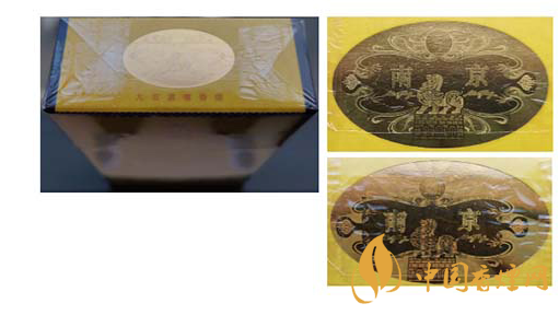假冒卷煙:該款假冒卷煙南京字體邊緣金色輪廓線和筆畫內(nèi)無小圓點,字體筆畫顏色暗淡,燙金套印有偏差。圖3上真下假