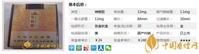 類型 :烤煙型 焦油量 :12mg 煙氣煙堿量 :1.1mg 一氧化碳量 :13mg