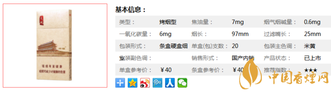 類型 :烤煙型 焦油量 :7mg 煙氣煙堿量 :0.6mg 一氧化碳量 :6mg