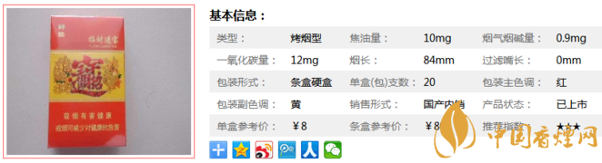 | 類(lèi)型 :烤煙型 | 焦油量 :10mg | 煙氣煙堿量 :1mg | 一氧化碳量 :13mg |