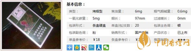 | 類(lèi)型 :烤煙型 | 焦油量 :6mg | 煙氣煙堿量 :0.6mg | 一氧化碳量 :5mg |