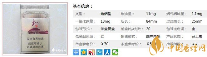 類型 :烤煙型 焦油量 :11mg 煙氣煙堿量 :1.1mg 一氧化碳量 :13mg