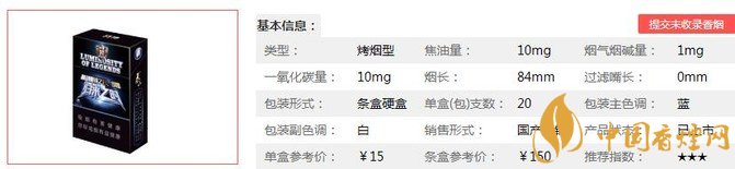 | 類型 :烤煙型 | 焦油量 :10mg | 煙氣煙堿量 :1mg | 一氧化碳量 :10mg |