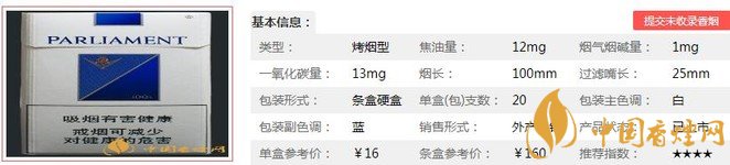 百樂門藍煙支長100mm,過濾嘴:22mm,濾嘴前端銀色的圓環(huán)圍繞著Silver Blue的銀色字樣;藍色的PARLIAMENT;上面是百樂門箭型的Logo。非常喜歡的煙支Logo設計,簡潔而漂亮!下面我們一起來看百樂門藍的參數(shù)信息:焦油量:12mg 煙堿量:1mg 一氧化碳量:13mg