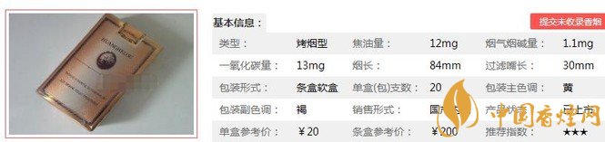 | 類型 :烤煙型 | 焦油量 :12mg | 煙氣煙堿量 :1.1mg | 一氧化碳量 :13mg |