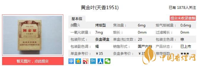 黃金葉天香1951從字面上理解和其本色本香的煙味應(yīng)該是向創(chuàng)牌于1951年“黃金葉”品牌的烤煙傳統(tǒng)致敬,自然本香、尊貴天香、高香低害、舒適輕松、本色包裝、傳承經(jīng)典,古色簡約的包裝風格同時也是對于經(jīng)典的傳承。經(jīng)香煙網(wǎng)小編市場調(diào)查黃金葉天香1951售價為35元/包。