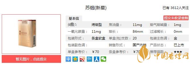 蘇煙(新星)和蘇煙(天星)是“蘇煙”全新推出的“星系列”的兩個(gè)原創(chuàng)型產(chǎn)品;這兩款“星系列”的主力規(guī)格共同承載“蘇煙”通過主銷價(jià)區(qū)向上延伸力爭(zhēng)實(shí)現(xiàn)提升品牌價(jià)值的戰(zhàn)略意義,并以此來鞏固和提升“蘇煙”在高端消費(fèi)者心目中所具有的“高端身份”的價(jià)值認(rèn)知。經(jīng)香煙網(wǎng)小編市場(chǎng)調(diào)查蘇煙新星售價(jià)為70元/包。