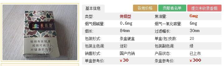 | 類型 :烤煙型 | 焦油量 :6mg | 煙氣煙堿量 :0.6mg | 一氧化碳量 :8mg |