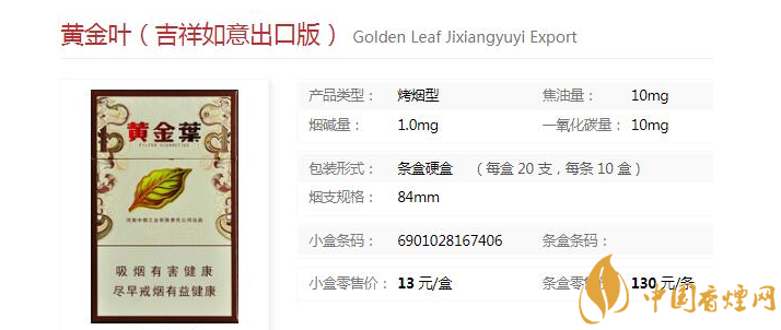 以上便是對黃金葉吉祥如意出口版香煙的價格及圖片介紹,希望為煙民提供幫助。小編在此告誡大家,抽煙對身體有傷害,希望大家盡早戒煙。想了解更多黃金葉香煙的相關(guān)內(nèi)容,歡迎點擊:喜滿堂香煙好抽嗎 黃金葉喜滿堂價格及口感分析一覽