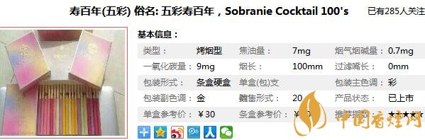 Sobranie譯為壽百年,為日本煙草公司所屬英國(guó)加萊赫公司產(chǎn)品,作為一個(gè)主要消費(fèi)對(duì)象是女性的香煙品牌,這款壽百年(五彩),也是表現(xiàn)的非常好,那么在對(duì)五彩壽百年香煙價(jià)格表進(jìn)行一個(gè)詳細(xì)的分析之前,先來(lái)看一看五彩壽百年多少錢(qián)一包,它的零售價(jià)為30元/包。