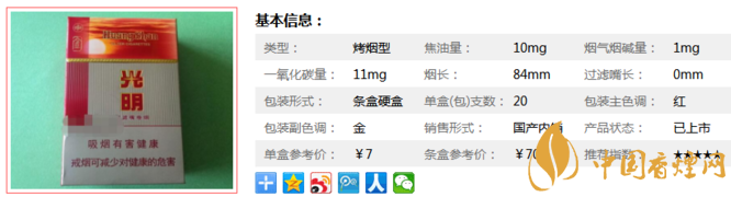 光明香煙是合肥的香煙品牌,“光明”卷煙是合肥卷煙廠60年代老品牌,當時被譽為“大火把”,現(xiàn)已整合進“黃山”品牌。是一款經(jīng)典又好抽的香煙,下面就由香煙網(wǎng)小編帶大家來了解一下光明香煙的相關(guān)參數(shù)信息。