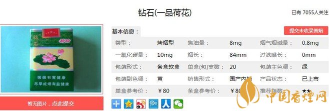 鉆石一品荷花于2014年上市,在高端卷煙市場占用很大的份額,濃淡適中的香氣,勁頭適中成為很多人的口糧。清雅脫俗的包裝設計更讓人愛不釋手,經(jīng)香煙網(wǎng)小編市場調(diào)查鉆石一品荷花售價為80元/包。
