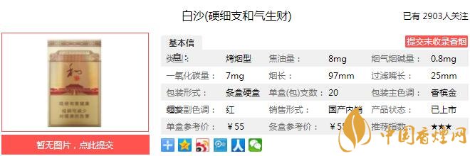 白沙硬細(xì)支和氣生財(cái)精選進(jìn)口優(yōu)質(zhì)煙葉,吸納高品位文化消費(fèi)者意見(jiàn),模塊化設(shè)計(jì)確定葉組配方,突出“口味醇和,生津返甜,余味悠長(zhǎng)”的高品質(zhì)特征。經(jīng)香煙網(wǎng)小編市場(chǎng)調(diào)查白沙硬細(xì)支和氣生財(cái)售價(jià)為55元/包。