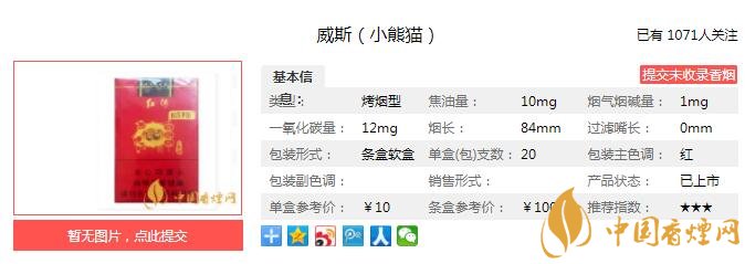 威斯小熊貓的前身是紅河小熊貓世紀(jì)風(fēng),紅河小熊貓世紀(jì)風(fēng)的前身是小熊貓軟紅世紀(jì)風(fēng)。品牌是一變再變,人氣卻一降再降,現(xiàn)在也是風(fēng)光不在了。經(jīng)香煙網(wǎng)小編市場調(diào)查威斯小熊貓售價為10元/包。