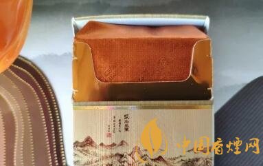 在煙盒處的腰間,一條金色的絲帶環(huán)繞整個(gè)煙盒。中央的水墨山水畫很是素雅,在畫中還有一段詩(shī)句,古香氣息彌漫。下半部的本公司提示不多贅述。