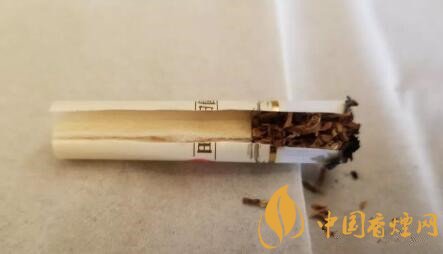 剖開濾嘴,為一段式的醋酸纖維絲束。沒有開降焦孔,絲束顏色淺黃,如此填充緊實的煙支,很不錯!絲束上有條帶狀色深帶,是豎紋盤紙導(dǎo)氣所致。
