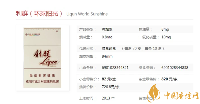 | 類型 :烤煙型 | 焦油量 :8mg | 煙氣煙堿量 :0.8mg | 一氧化碳量 :10mg |