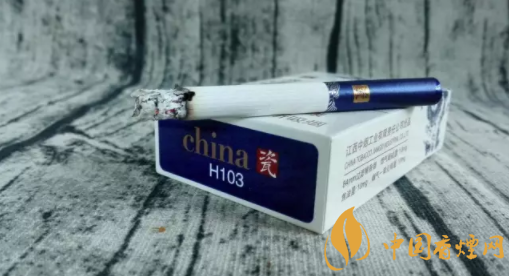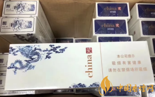 煙盒正面主圖為青花騰龍造型,張牙舞爪,欲入深海而攪起驚濤駭浪。煙盒頂端,印有青花瓷瓶的圖案,同時加以文字簡介。煙盒底端主色調(diào)為深藍,與正反兩面的藍色青花龍色調(diào)相輔相成。China和瓷的品名,再次印制于此部位。H103,是指產(chǎn)品的隨機編號。
