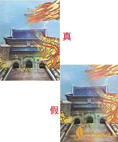 真煙小盒正面天空波浪紋、中山陵屋頂瓦片清晰連貫;假煙小盒正面天空波浪紋、中山陵屋頂瓦片模糊不清,時(shí)有時(shí)無。