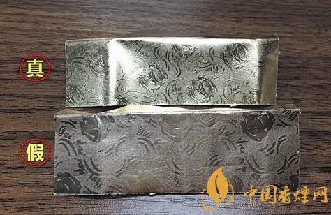 假冒:非常粗糙,方向錯位,位于煙盒的左側(cè)。