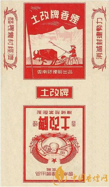 1951~1952年云南紙煙廠出品。主圖為農(nóng)民駕耕牛犁田,副圖為草帽鋤頭麥穗圍成紅色圖案,“發(fā)展農(nóng)村經(jīng)濟(jì)、消滅封建勢力”字樣,表現(xiàn)農(nóng)民第一次成為土地的主人,在田間精心勞作形象。1950年云南和平解放,1951年開展大規(guī)模的土地改革運(yùn)動。該煙標(biāo)是中國煙標(biāo)史上少見的“土改”牌煙標(biāo)。