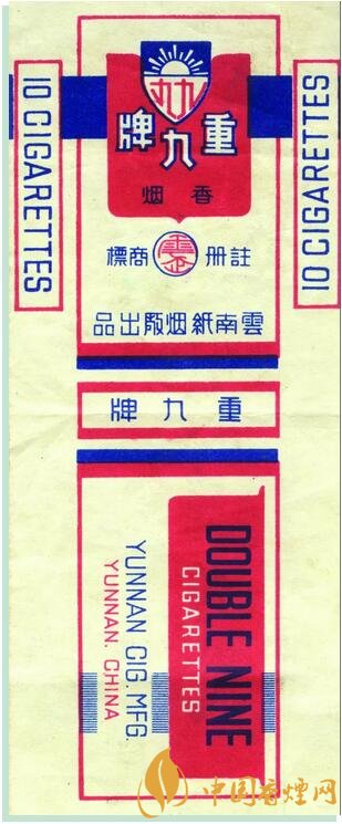1945年,云南紙煙廠出品。創(chuàng)牌于1922年,為紀(jì)念護(hù)國名將蔡鍔等所領(lǐng)導(dǎo)的“重九起義”而創(chuàng)牌,重九牌歷史悠久,具有豐富的文化內(nèi)涵,是云南紙煙廠的榮譽(yù)產(chǎn)品。該牌號卷煙僅生產(chǎn)13.85箱,屬罕見珍貴煙標(biāo),具有歷史文物價(jià)值。1945年6月1日云南紙煙廠在昆明金碧日報(bào)刊登“重九”牌更換商標(biāo)紙盒啟示 , 以此啟示為證改寫了此枚珍貴歷史商標(biāo)的確切生產(chǎn)時間。