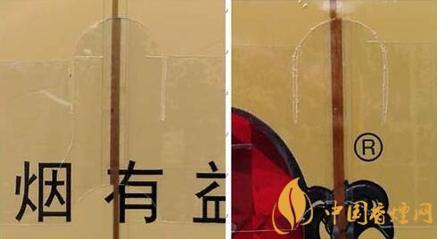 1.商標字體印刷。真品卷煙商標印刷采用“凹印”,兩種顏色交界邊緣呈現(xiàn)虛邊或鋸齒狀。假冒卷煙商標印刷一般采用“膠印”,兩種顏色交界邊緣比較清晰、光滑,無鋸齒狀。(圖1左真右假)