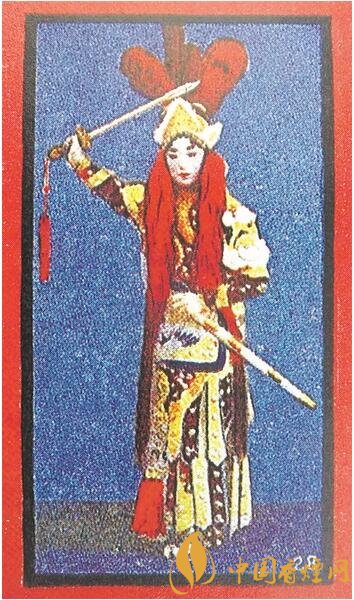 英美煙公司出品的“著名京劇演員劇照”煙畫,70枚一套,其中第28枚為“尚小云之秦良玉”(上圖),為照片版,展現(xiàn)了著名京劇演員尚小云扮演的秦良玉身著戎裝、手持寶劍的形象,背面則印有人名、劇名及演員簡介。