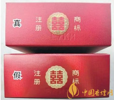 真煙背面中間“花球”激光鐳射立體感強(qiáng)、層次分明、圖案清晰、且“囍”字在花球中間位置;假煙背面中間“花球”激光鐳射無(wú)立體感、層次不清、圖案較模糊,且“囍”字明顯偏離中間位置。
