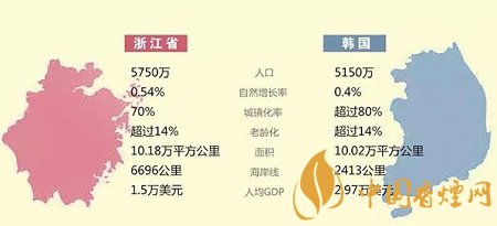 從人口來看,2018年韓國人口總數(shù)約為5150萬,自然人口增長率為0.4%,城鎮(zhèn)化率超過80%。浙江全省常住人口約為5750萬,自然增長率為0.54%,城鎮(zhèn)化率接近70%。從人口規(guī)模、人口增長率來看,浙江略高于韓國,從城鎮(zhèn)化水平來看,又略低于韓國。這些要素的“差不多”,使得韓國、浙江卷煙市場容量、城鄉(xiāng)結(jié)構(gòu)、業(yè)態(tài)類型的比較具備了參考性。