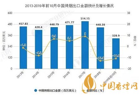 在出口金額方面,2019年10月中國(guó)烤煙出口金額為2021.7萬(wàn)美元(20.22百萬(wàn)美元);2019年10月中國(guó)烤煙出口均價(jià)為0.33萬(wàn)美元/噸,相比9月下跌了0.01萬(wàn)美元/噸。累計(jì)方面,2019年1-10月中國(guó)烤煙出口金額達(dá)到328904千美元(328.9百萬(wàn)美元),同比下降10.8%,出口均價(jià)為0.36萬(wàn)美元/噸。