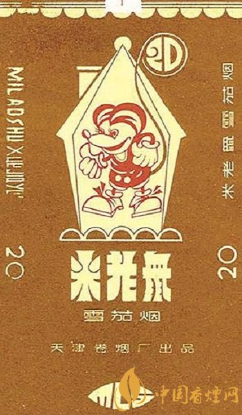 上世紀80年代,天津卷煙廠出品的“米老鼠”煙標,則為我們展示了一只卡通米老鼠的形象。該標主副版均為長著圓圓耳朵的米奇老鼠在妙妙屋中生活的畫面,其形象洋溢著美式卡通特有的調侃、樂天、嬉皮、滑稽的美國文化精神,米老鼠是有著卡通天才、娛樂業(yè)大王之稱的美國人沃爾特·迪尼斯精心打造的卡通形象。