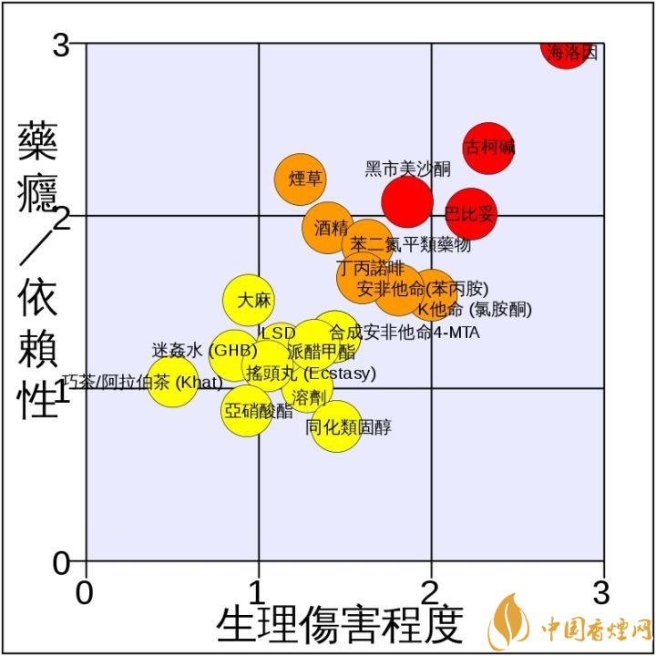 結(jié)尾分享一下剛看到的研究發(fā)現(xiàn)。20位從事依賴性治療的精神病醫(yī)師,在二十種常見管制藥品比較其傷害性(橫軸)及成癮性(縱軸),于2007年發(fā)表在權(quán)威醫(yī)學(xué)期刊《柳葉刀》,顯示煙草在成癮性排名第三,潛在危害程度排名第七,可見煙草的依賴性和傷害可能比某些傳統(tǒng)毒品還大。