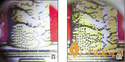3.小盒背面華表底座微縮印刷工藝差異對(duì)比:真煙微縮防偽印刷圖案效果呈現(xiàn)主次分明、清晰度高、套印準(zhǔn)確的特點(diǎn);假煙采用照相或掃描的方法仿制,字體及圖案變形增大,無(wú)主次感,微縮字體及圖案比較粗糙,呈現(xiàn)出來(lái)的效果是模糊不清的。
