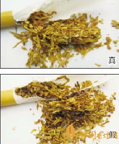 5.煙絲結(jié)構(gòu)及成色差異對(duì)比:真煙的煙絲呈金黃色(或橙黃色),色澤均勻一致,含煙末少;假煙的煙絲顏色較深,含煙梗及煙末較多,填充性差。