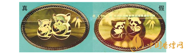 正面文字差異對(duì)比:真煙“小熊貓”字樣字體較粗,字形渾厚有力,凸起明顯,燙金緊湊均勻;假煙“小熊貓”字樣字體較細(xì),似連似斷,凸起不明顯,邊緣燙金較寬。