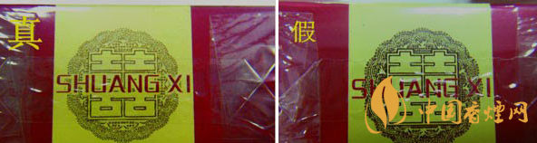 真假商標紙顏色差異比對:真品商標紙顏色為深紅色,正面喜字燙金邊緣有凸起感;假煙商標紙顏色多為鮮紅色,正面喜字為平版印刷且邊緣未見凸起感,與真品存在明顯差異。