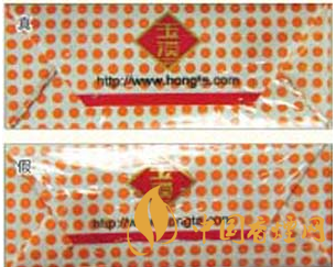 4.小盒底部包裝工藝及商標紙印刷差異對比:真煙小盒底部商標紙折疊采用機械水流包裝工藝,底部兩端折疊平整且折角對等,商標紙邊緣印刷完全性好,無脫漆掉色現(xiàn)象;假煙小盒底部商標紙折疊多采用手工包裝,折疊不夠平整,均為“凸起”狀,商標紙邊緣多有脫漆掉色現(xiàn)象。