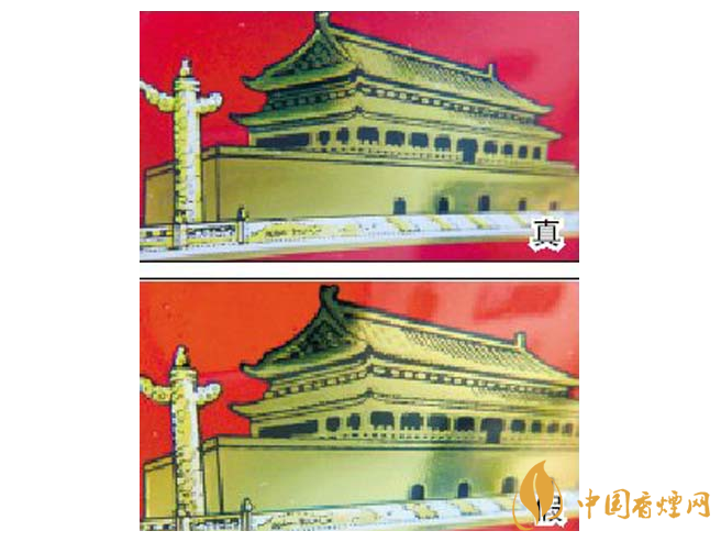 1.小盒正面商標(biāo)紙?zhí)咨珷C金工藝對比:真煙天安門左側(cè)華表套色均勻,黃白色分布有明顯分界點(diǎn),邊緣光滑、干凈、清晰;假煙套色較差,黃白色不明顯,黃色部分印刷較分散,字體邊緣套印有毛渣點(diǎn),呈現(xiàn)鋸齒狀。